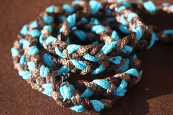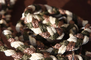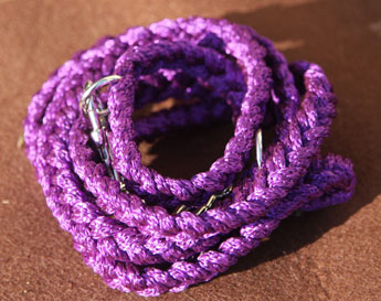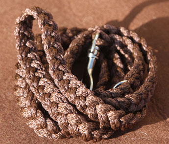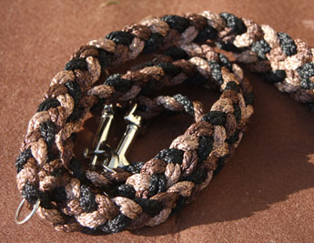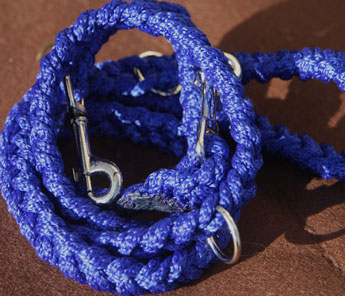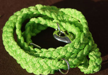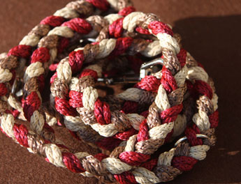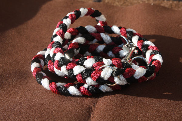 Die Flechtleinen sind im "traditionellen Zopfmuster" gefertigt und in 2 verschiedenen Breiten erhältlich, die schmalen sind etwa 0,75 cm breit, die breiten ca. 1,3 cm. Die breiteren Leinen haben auch etwas grössere Karabiner und Ringe.