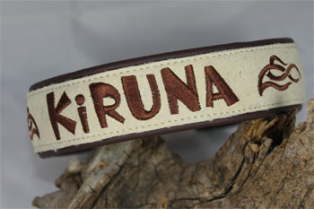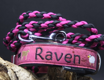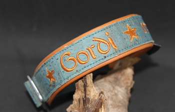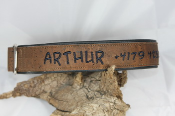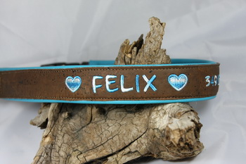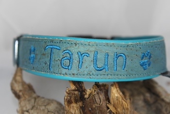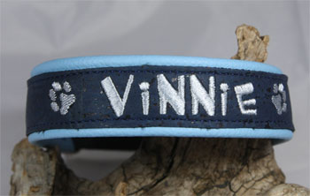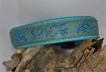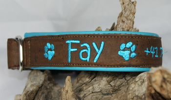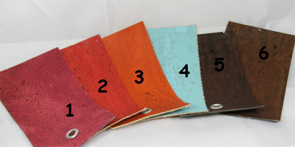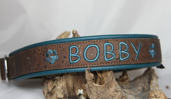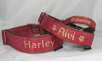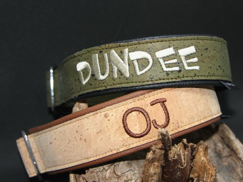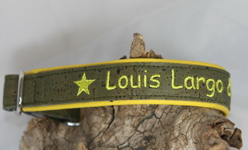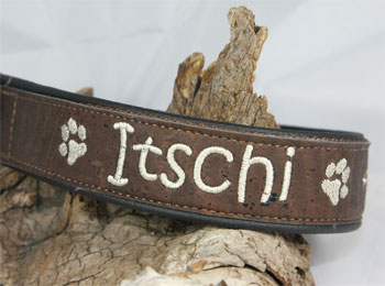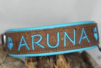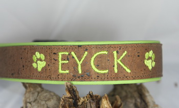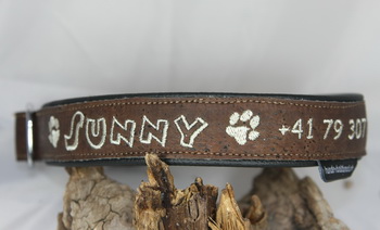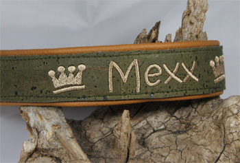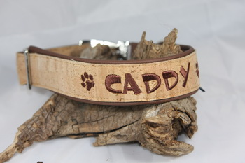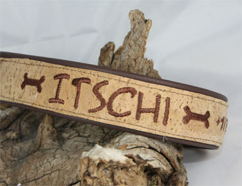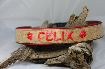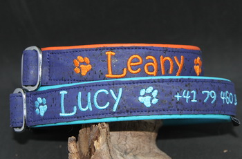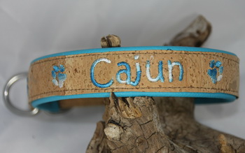 Die Korkhalsbänder werden mit Leder oder Kunstleder unterlegt, alle Farben gem. Farbkarte sind möglich.